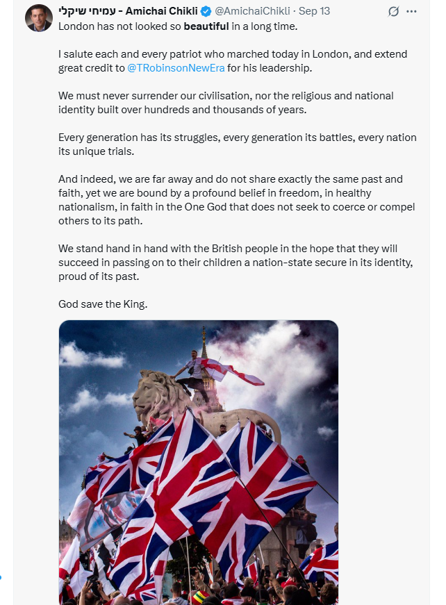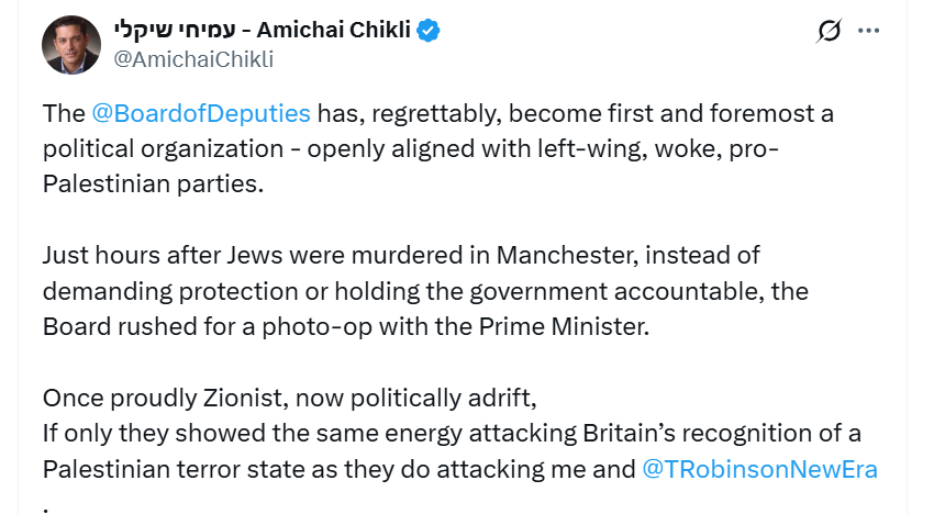 In response to the criticism from British Jewish organisations concerning the Robinson invitation, Chikli doubled down and launched an extraordinary attack on the Board of Deputies, accusing them of being aligned with “left-wing, woke, pro-Palestinian parties”: