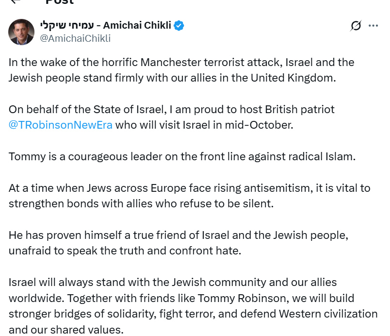“In the wake of the horrific Manchester terrorist attack, Israel and the Jewish people stand firmly with our allies in the United Kingdom. On behalf of the State of Israel, I am proud to host British patriot Tommy Robinson.