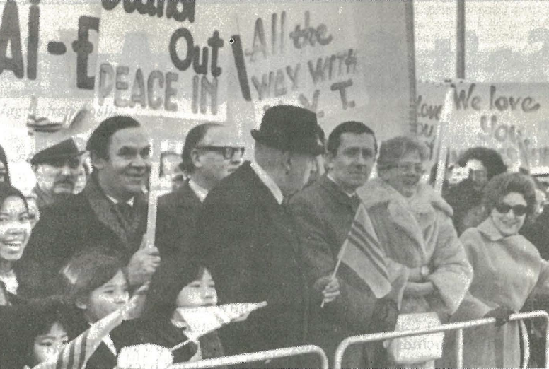 Don Martin with Lady Jane Birdwood (in fur coat) greeting South Vietnamese dictator Nguyen Van Thieu at Heathrow in 1973
