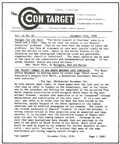 A more recent example of Martin’s subtle antisemitism appeared in the October 1999 edition of On Target. Commenting on the moral decay of western Christian society, Martin attacks the philosophy of “world revolution” for destroying the “Existing Order”.