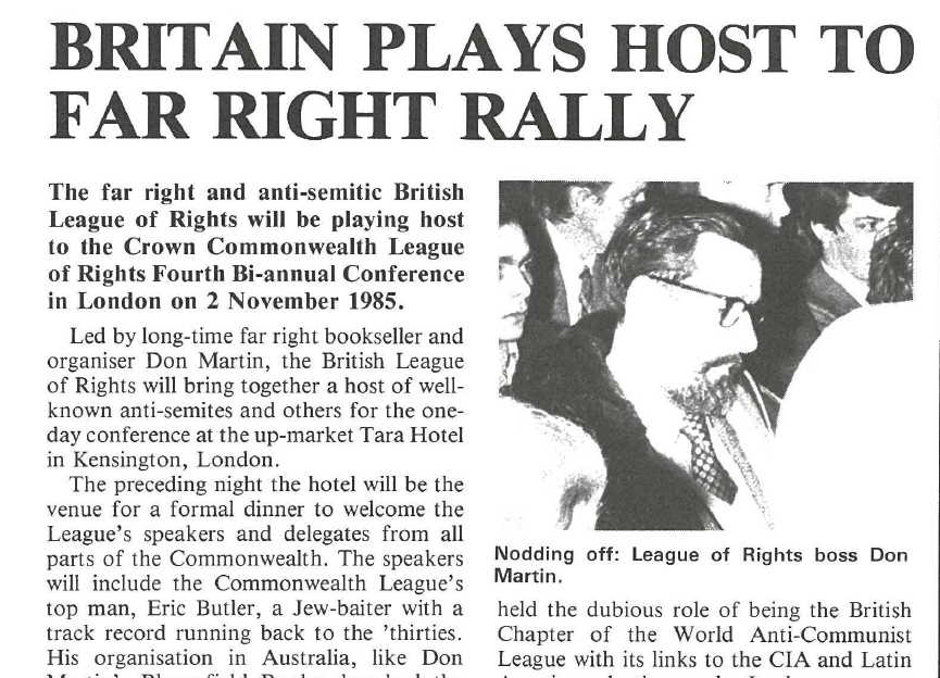 In 1985 Searchlight reported how Martin brought many of these leading antisemites together at The Crown Commonwealth League of Rights conference in London.