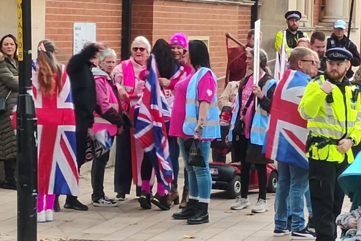 A group of ‘Pink Ladies’ were prominent, two of them arriving with a male companion with a loud hailer who chanted ‘don’t trust your children with a Leftie’ as he walked right into the counter protestors.