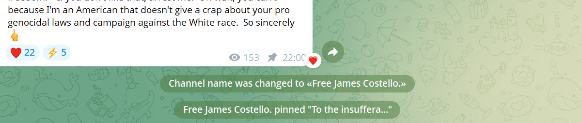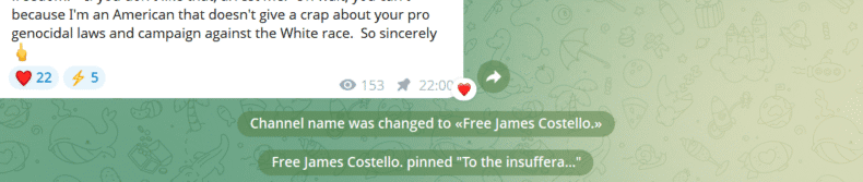 Only hours after we published our piece, the name of Costello’s Telegram Channel, where a link to a hardline nazi site had been posted while Costello was in prison, was hurriedly changed and an American fellow nazi claimed publicly that he had been responsible for everything posted there.