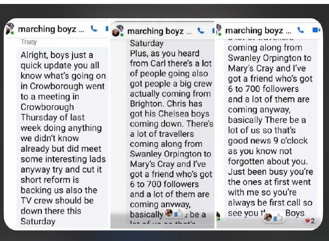 - Marching Boyz, a violent street crew, mobilised supporters from Brighton, Swanley, Orpington and Chelsea. Internal chats revealed coordination with hundreds of followers.