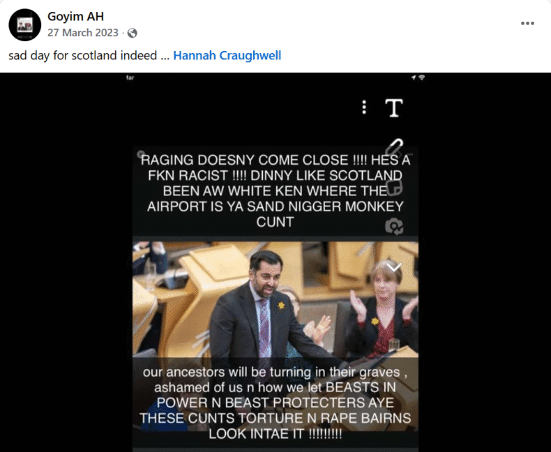 She also used the Facebook account to circulate material supporting the Highland Division a breakaway from Patriotic Alternative, and repost material from PA’s James Costello, who has just been released from prison after serving a sentence for inciting racial hatred.
