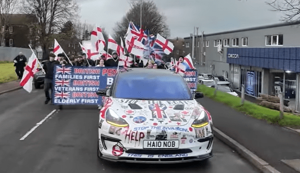 Following our reports on ‘Fash’ Harry Hilden’s inauspicious anti-migrant demo in Folkestone recently, followed by last Saturday’s UKIP march in Dover, Searchlight supporters have been in touch to add delicious detail to the colourful tapestry that is the saga of Shaun Chaney, driver of the wraparound racist Tesla which headed up both demonstrations.