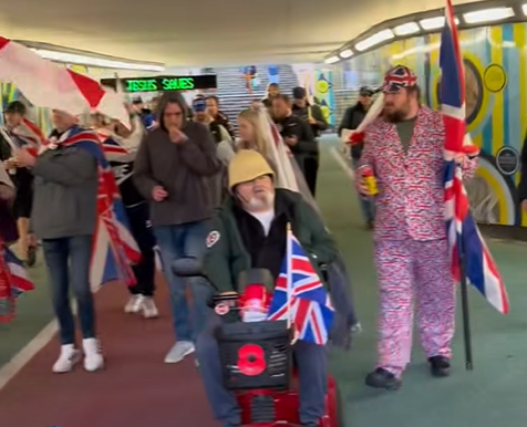 Faversham’s “Fash Harry” Hilden had backed the event online and was there in the crowd, wearing an “NEFD” (National Emergency Faversham Division) hat, with at least one companion, but clearly present only in a minor supporting role.