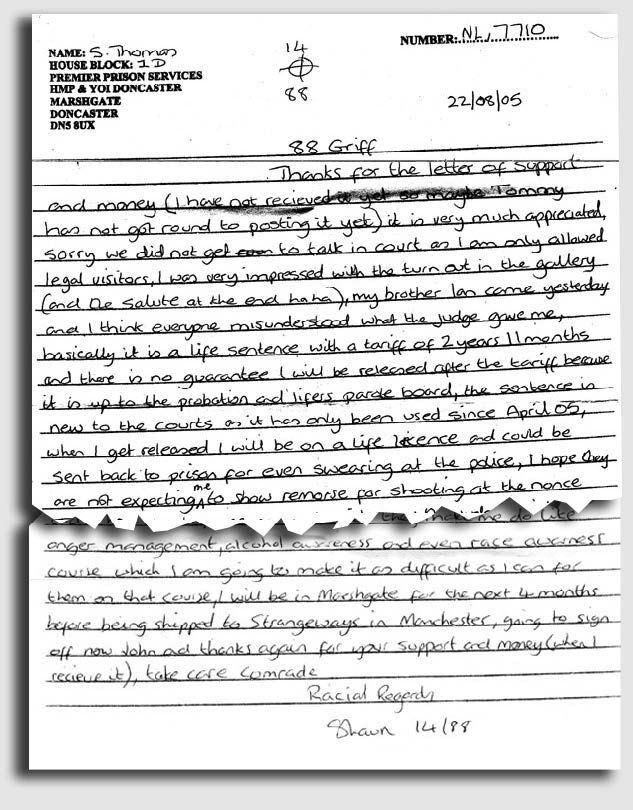 Three days after he was jailed, Shaun Thomas sent a letter from his cell in Marshgate prison and young offenders’ institution, Doncaster, urging his far-right colleagues to take action against the man he had failed to kill, telling them where to find him and how to ensure that he ended up killed or maimed.