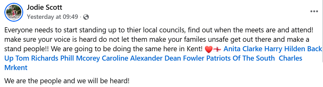 Jodie Scott, aka MissusKent, is calling on her followers across the country to disrupt council meetings in the way a meeting at Swale in Kent was disrupted before Xmas.