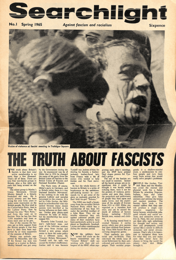 When support for the National Front surged in the 1970s, threatening to normalise fascist politics in Britain, the former leadership of the by-now-defunct 62 Group decided to relaunch Searchlight as a monthly magazine, edited by Gerry and Birmingham-based journalist Maurice Ludmer, a prominent trade unionist and hugely respected anti-racist veteran.