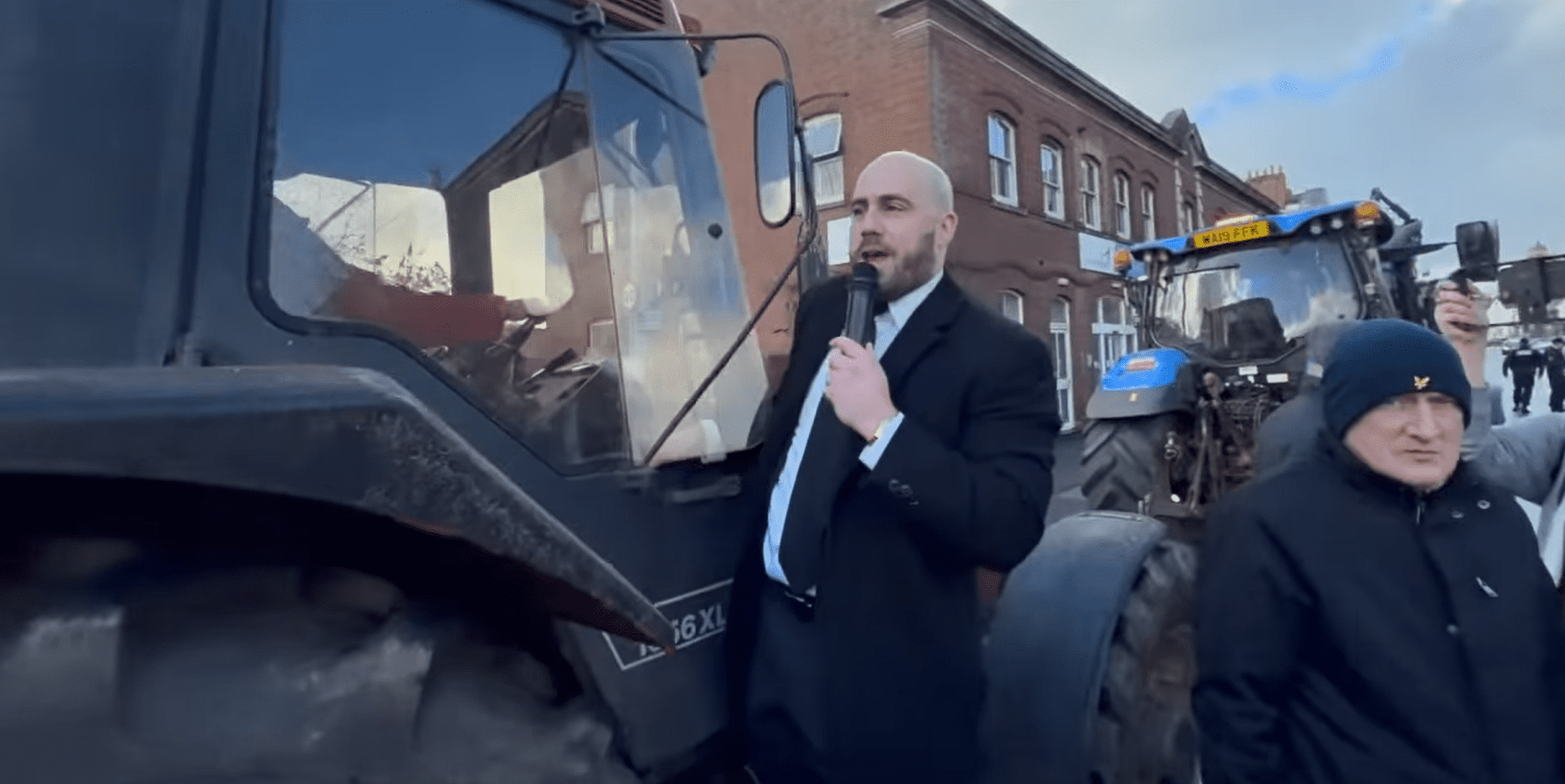A few local farmers in tractors joined Tenconi’s march on Queen Street, apparently arranged by local thug and Tommy Robinson supporter Jordan Rowe. Tenconi attempted to climb aboard a tractor to deliver a speech, not appreciating how tricky this might be – and was – with his little legs in a tight suit.