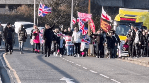 The group had earlier marched, very slowly, from the fascists’ favourite Dover watering hole, the Golden Lion, to the reception facility, briefly slowing down traffic on the A20.