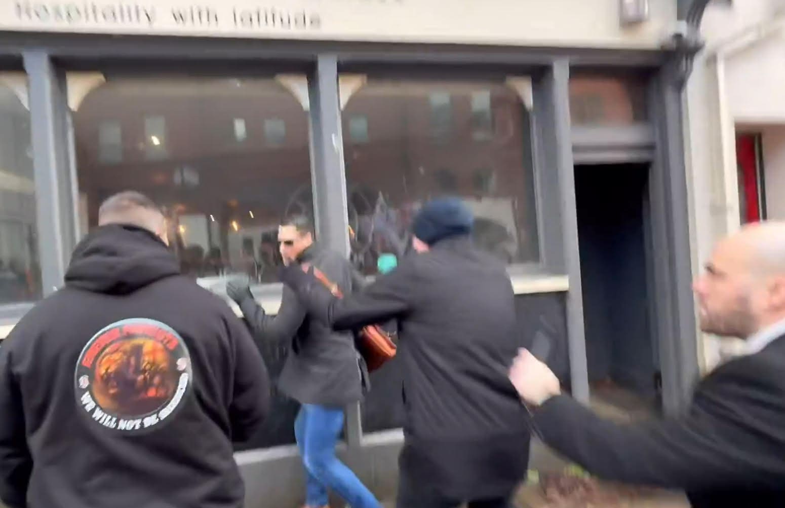 In the clip, a slight man wearing sunglasses steps towards Tenconi, makes no physical contact, and verbally denounces him as a “pro-Nazi piece of shit”.