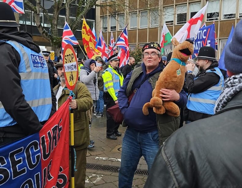 True to form, he pestered people and ranted into his web cam about them. He was duly told by a police officer to stop trying to wind up the counter-protestors and get behind police lines on his side. “I’ve dealt with you before,” the officer said.