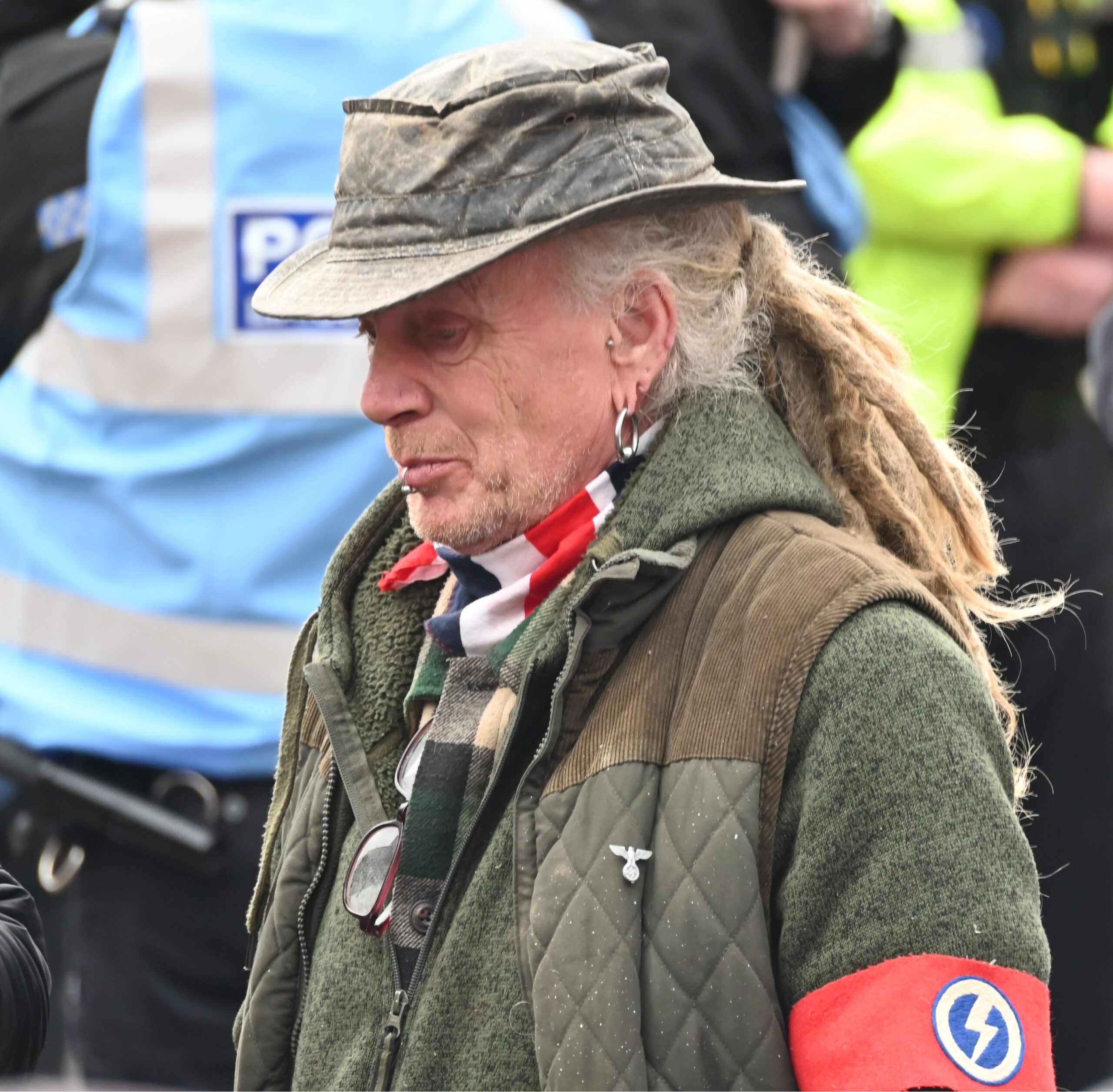 In addition, there was a solitary miserable looking fascist wearing a red armband with a Mosleyite “flash in the pan” symbol. This symbol was used by both the British Union of Fascists (BUF) and post war Mosleyite groups.
