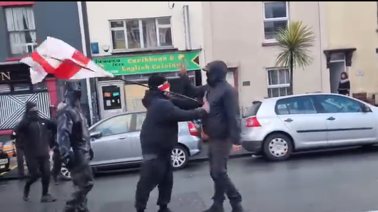 Around 20 fascists, dressed in dark clothing, most masked and hooded and waving Saint George’s cross flags, attempted to force their way into the venue.