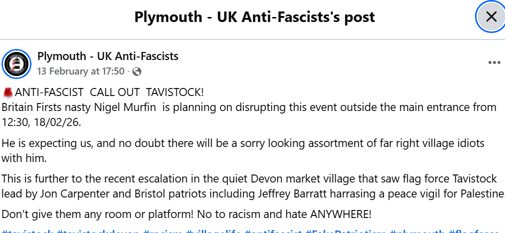 A Stand Up To Racism campaigner had been assaulted in Exeter the previous day, and fascists are now reported to be planning an attack on tomorrow’s Together UK fundraiser in Tavistock, a small market town on the edge of Dartmoor.