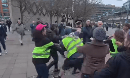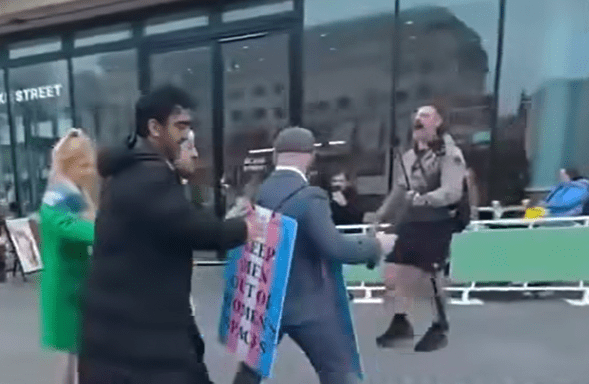 The trouble was kicked off by James and another anti-trans demonstrator but they were soon joined by Messenger and other thugs who joined in.