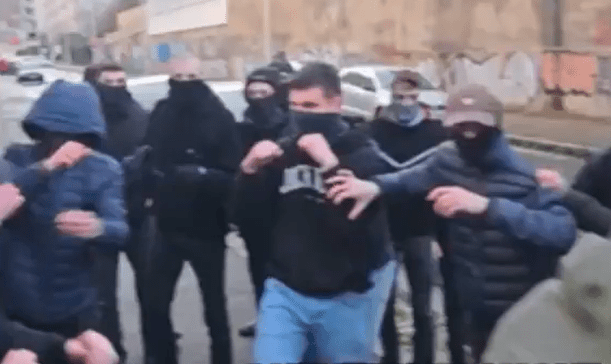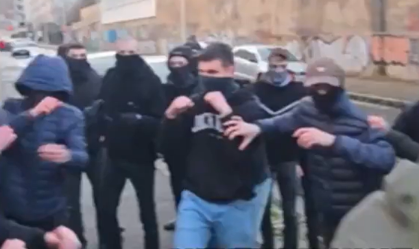 On other footage, he can be seen in a combat stance at the forward edge of the far-right group. He wore a balaclava throughout the brawl.
