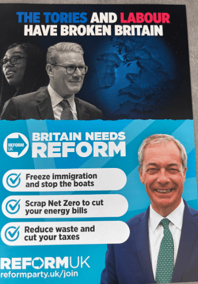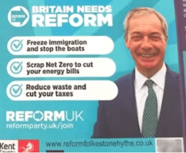 In Kent, leaflets urged voters to back Reform and promised to “reduce waste and cut your taxes.”