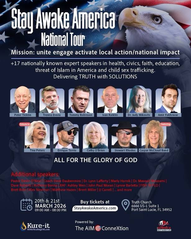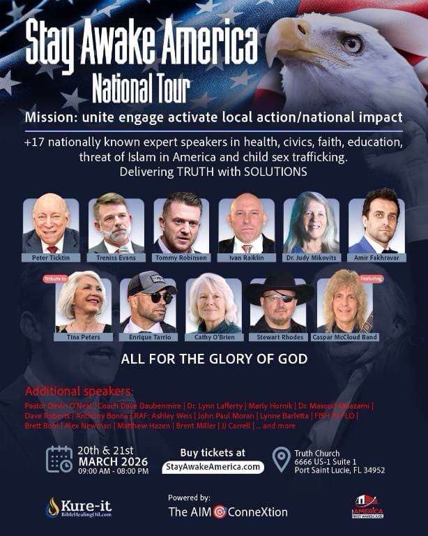 The Florida leg of the tour which followed brought yet more alarming company. Robinson is listed as a speaker at the Stay Awake America National Tour, a two-day event being held today and tomorrow at a church in Port Saint Lucie, which saw Robinson rubbing shoulders with some of the most toxic, extreme elements on the American far right.