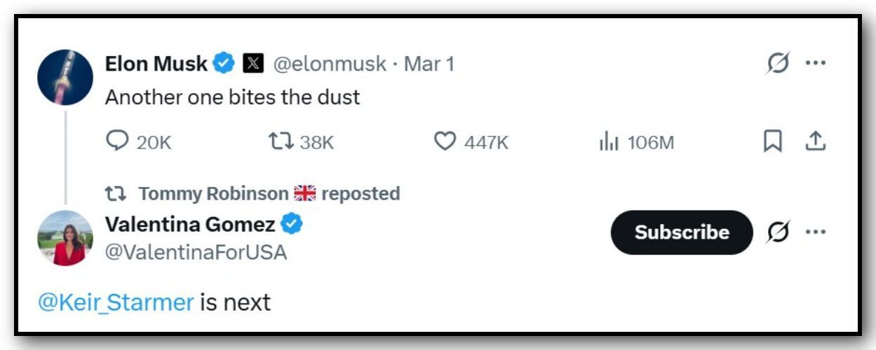 In response, Columbian-born far-right influencer Valentin Gomez Noriega posted: “Keir Starmer is next” – a comment which Robinson reposted to his 1.9 million followers without comment.