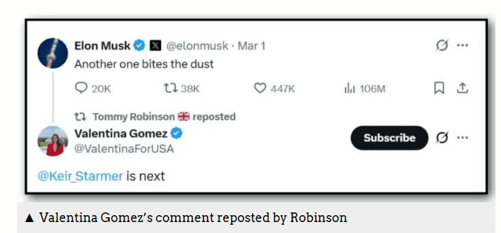 Tommy Robinson, touring the US, reposted it, beneath which Gomez added the comment “@KeirStarmer is next.”