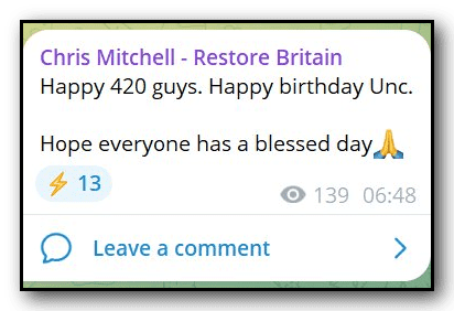 The post was visible to the roughly 160 members of his channel, which Mitchell renamed the Restore Britain War Room.