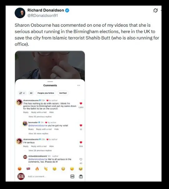 More recently, in January this year, Osbourne responded to an Instagram post by far-right activist Richard Donaldson about reports that a convicted terrorist would be standing for the council in Birmingham (her husband’s home city) at this May’s elections.