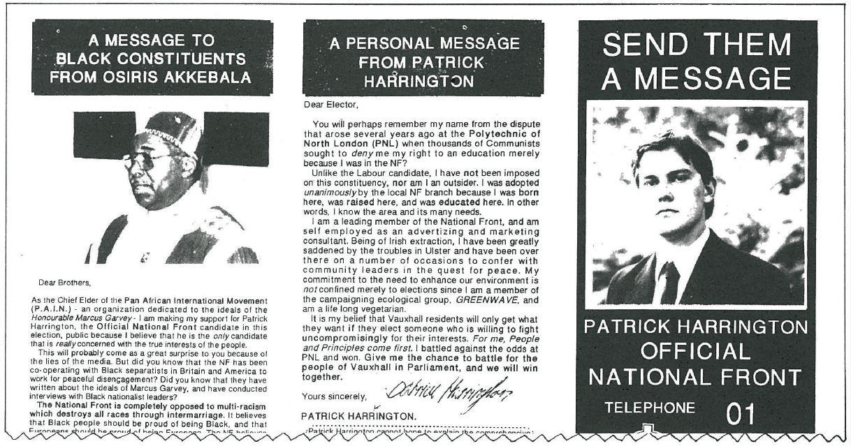 A year later Akkebala endorsed Patrick Harrington’s campaign at the Vauxhall parliamentary by-election. His “message to black constituents” printed in NF leaflets included praising the Front for being “completely opposed to multi-racism which destroys all races through intermarriage.”